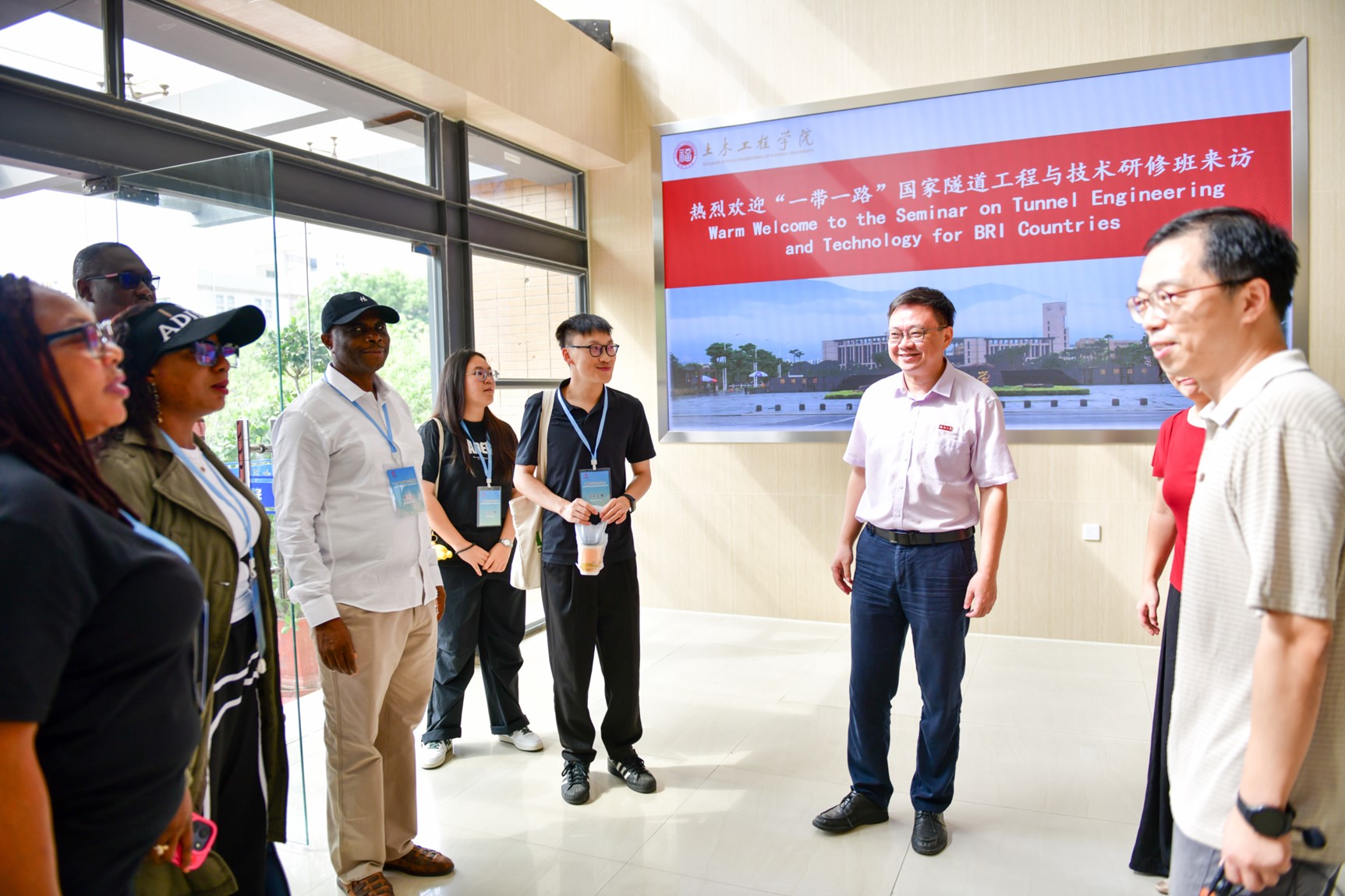 2025年10月14日上午,由商务部主办、福建省对外经济合作中心承办的“一带一路”国家隧道工程与技术研修班,组织老挝、加纳、尼日利亚30名外宾到访福州大学土木工程学院开展参观考察。活动旨在搭建国际交流平台,分享中国经验与福建实践,深化学院与 “一带一路”国家在基础设施领域的合作。